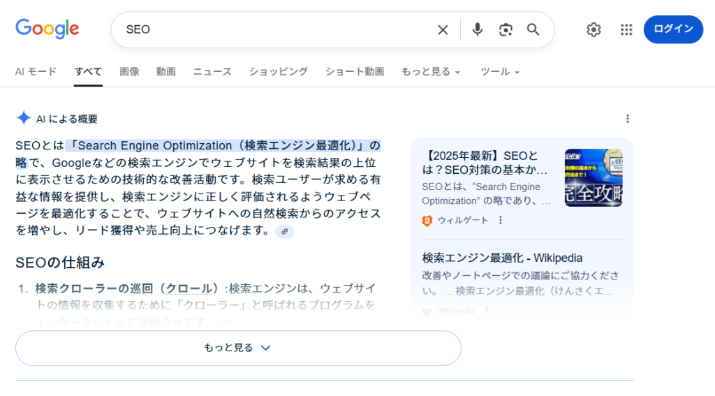 AIモードを利用すると、従来の検索結果ページとは異なる形式が表示されます。