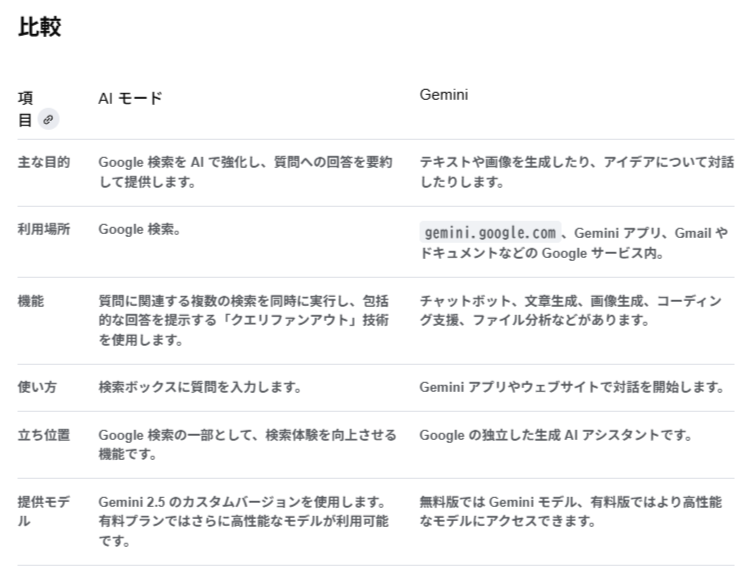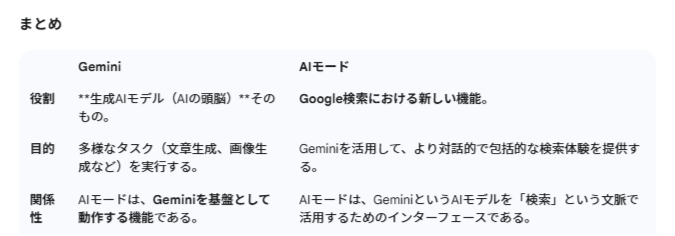 どちらにも共通しているのは、「AIモードは検索を効率化するツールで、Geminiは多様なタスク(文章生成、画像生成など)を実行するツールである」ということ。