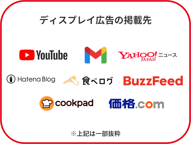 ディスプレイ広告は、Googleディスプレイネットワーク(GDN)やYahoo!広告 ディスプレイ広告の広告ネットワークを通じて、数百万以上のサイト・アプリに掲載されます。