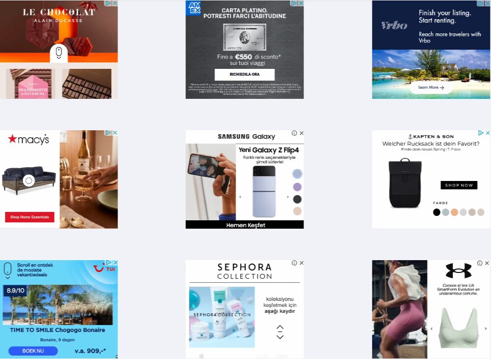 Criteoの代名詞ともいえるのが、ダイナミック広告です。ユーザーごとに異なる商品を自動的に表示し、興味関心に応じた訴求を行います。たとえば、Aさんにはスニーカー、Bさんにはバッグを表示するなど、一つの広告枠で複数パターンの配信が可能です。