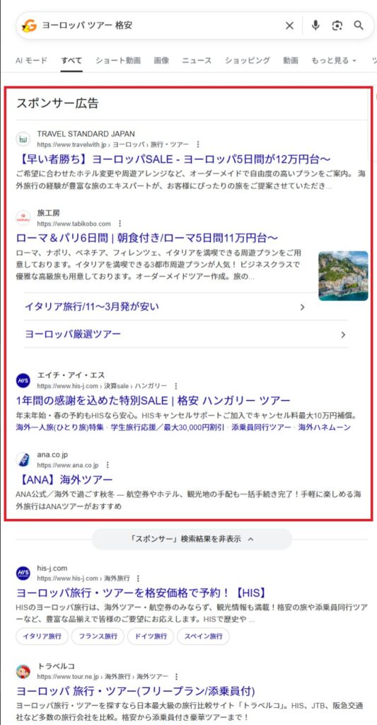 特にスマホでは、広告枠の3〜4位あたりが自然検索結果に近いデザインで表示される印象で、ユーザーによっては広告であることを即座に認識しづらい可能性もあるなと感じました。